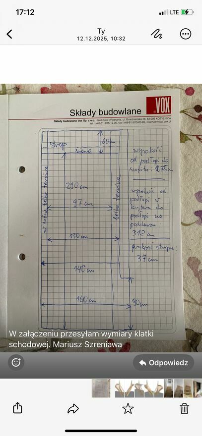 Zlecę wykonanie schodów drewnianych samonośnych , zabiegowych, na konstrukcji drewnianej lub metalowej. Długość stopni ok. 98 cm w otworze wejściowym i wyjściowym (3 stopnie), 9-10 stopni o długości 110 cm, oraz 4-5 stopnie zabiegowe. Łącznie planuję 17 stopni ( razem z ostatnim na poziomie posadzki). Poniżej na rysunku orientacyjne wymiary pomieszczenia na schody. Mariusz tel. 504 - pokaż numer telefonu -Mariusz